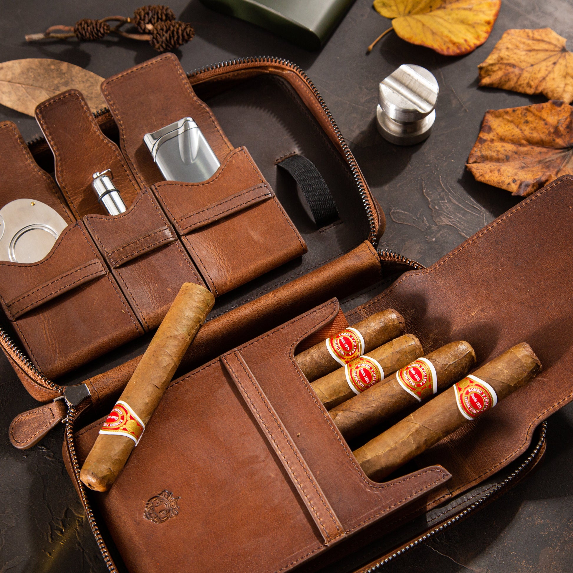 Crown & Tiger Full Leather Cigar Case - finest Leather premium quality - Travel Case keeps your accessories and up to 5 Churchill safe - Handmade
