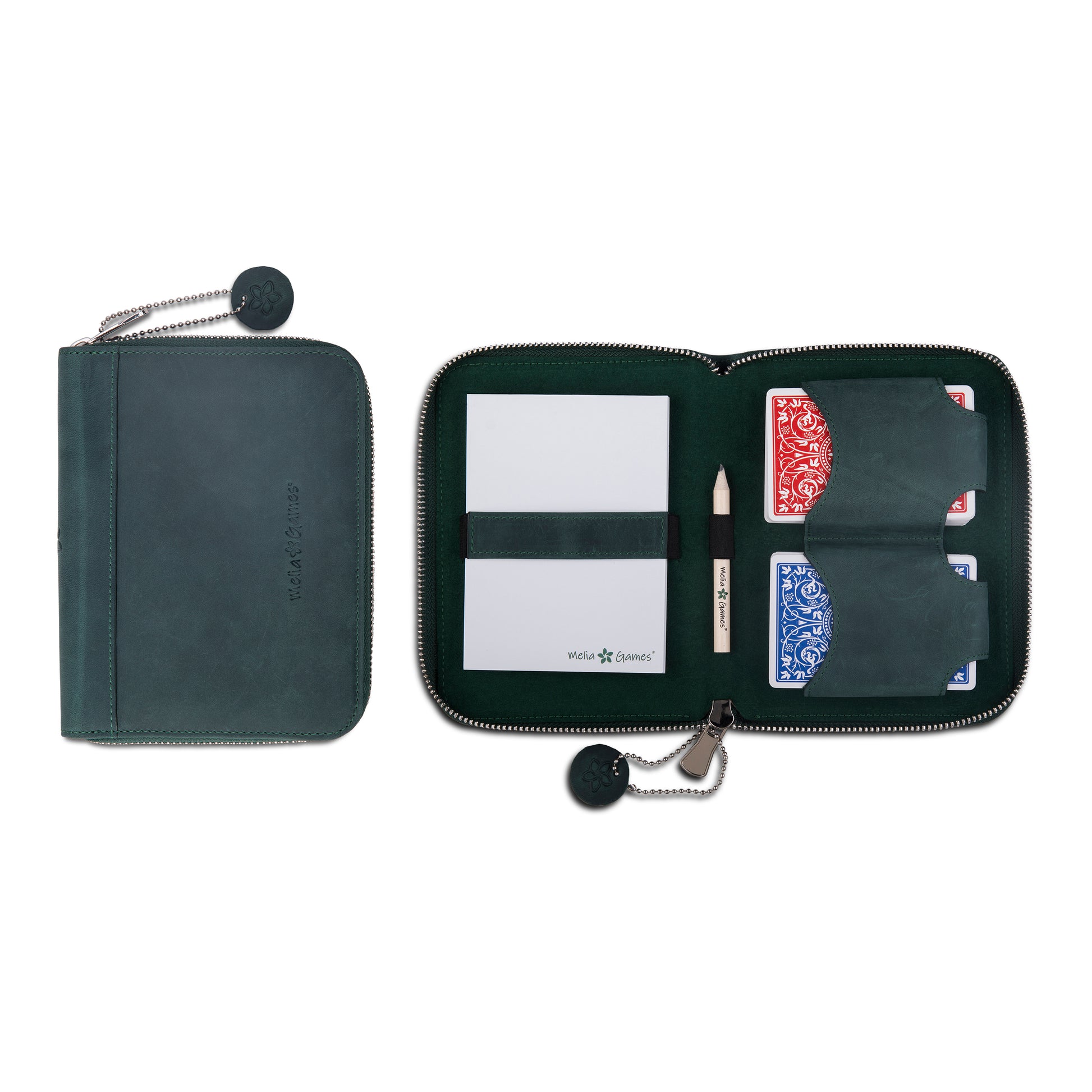 Handmade using sustainable, finest full-grain leather, the zip case houses 2 decks of playing cards, perfect for rummy, canasta, poke, bridge and more, a notepad, and pencil for keeping score.